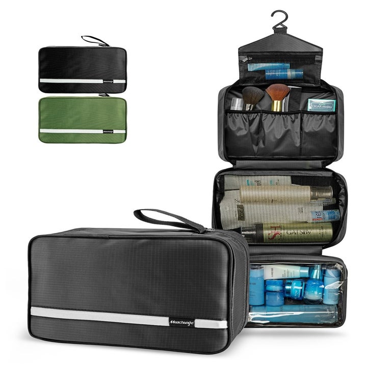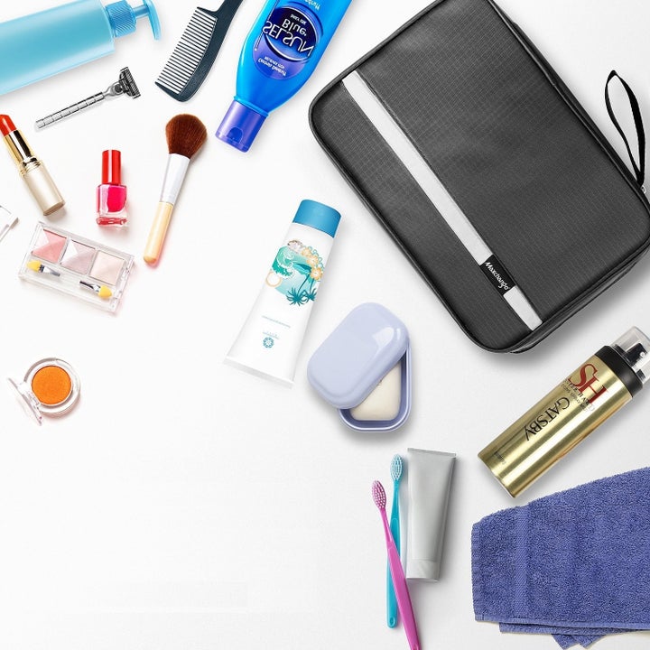 7. Store your go-to toiletries or makeup in this waterproof travel bag. It can be zipped to become compact, or hung vertically with a hook, so it's perfect to save space and stay organized.